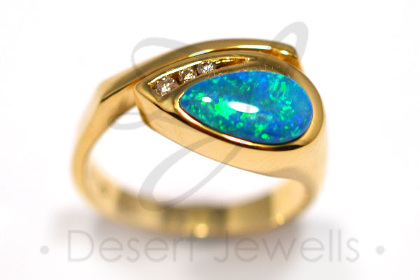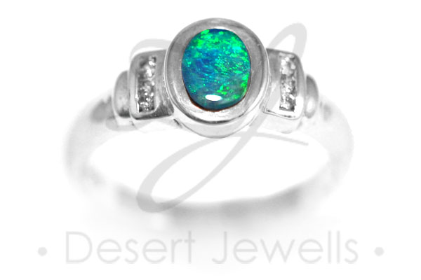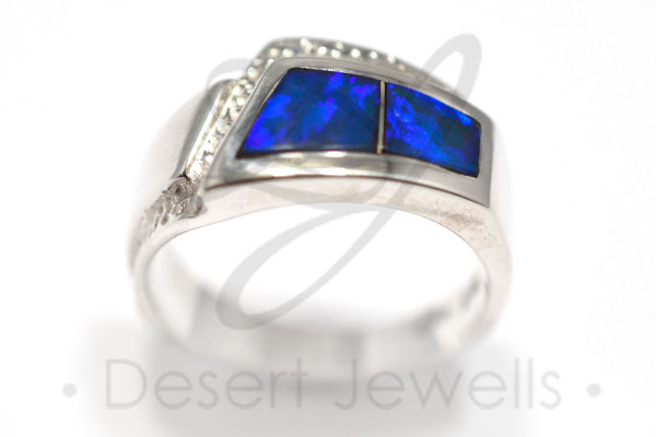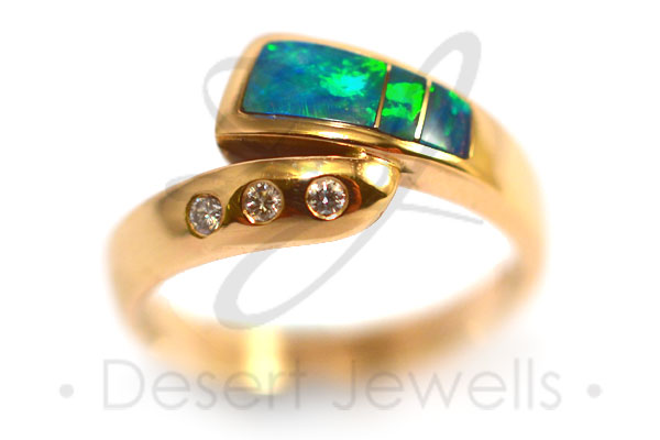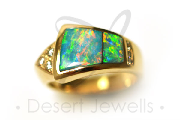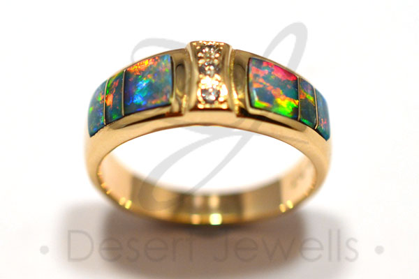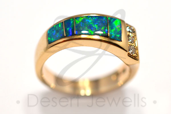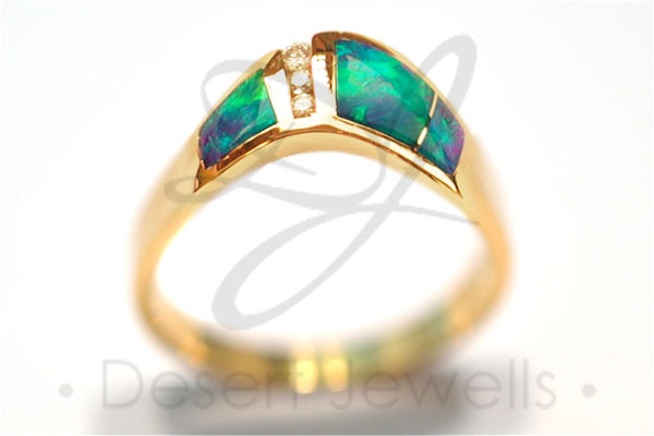 Gem quality inlay Opal ring with diamonds on both shoulders.